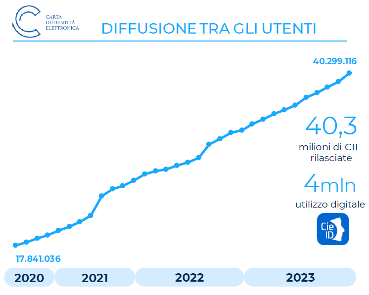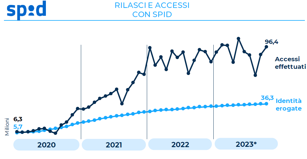 In Italia il Sistema pubblico di identità digitale (SPID) vede 36,4 milioni di identità erogate (che non corrispondono al numero dei cittadini in possesso di SPID, poiché un cittadino potrebbe avere chiesto più di un’identità basata su questo sistema) con 902 milioni di accessi nel 2023. La Carta di identità elettronica (CIE) vede 40,3 milioni di tessere erogate con 4 milioni di utenti che utilizzano la CIE in modalità digitale attraverso l’app CieID.