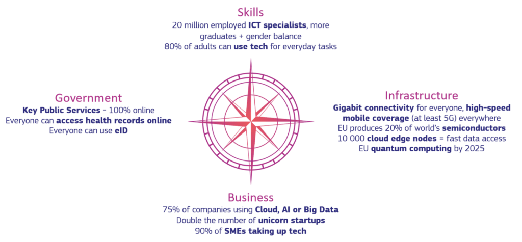 Nel Digital decade sono definiti quattro assi di intervento (competenze, imprese, Pubblica amministrazione, infrastrutture), a ognuno dei quali è associato uno specifico set di indicatori, che rappresentano la bussola per orientare le politiche digitali europee.