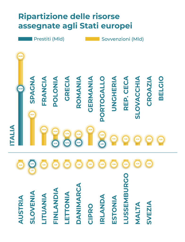 Come abbiamo visto sopra, attraverso il NextGenerationEU l’Europa destina all’Italia 191,50 miliardi di euro, anche in ragione del fatto che è stata una delle nazioni più colpite dalla pandemia COVID19. Di queste risorse il 36% è a fondo perduto, mentre la parte più importante (64%) è a prestito con l’obbligo di ripagarle tra il 2028 e il 2058 a un tasso di interesse a condizioni agevolate.