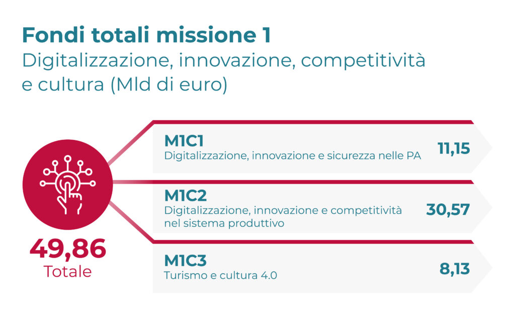 La missione relativa alla transizione digitale “Digitalizzazione, innovazione, competitività, cultura e turismo” è la prima misura del PNRR e vede un investimento complessivo di 49,86 miliardi di euro (40,32 nel NextGenerationEU, 0,80 nel REACT-EU e 8,74 negli investimenti complementari).