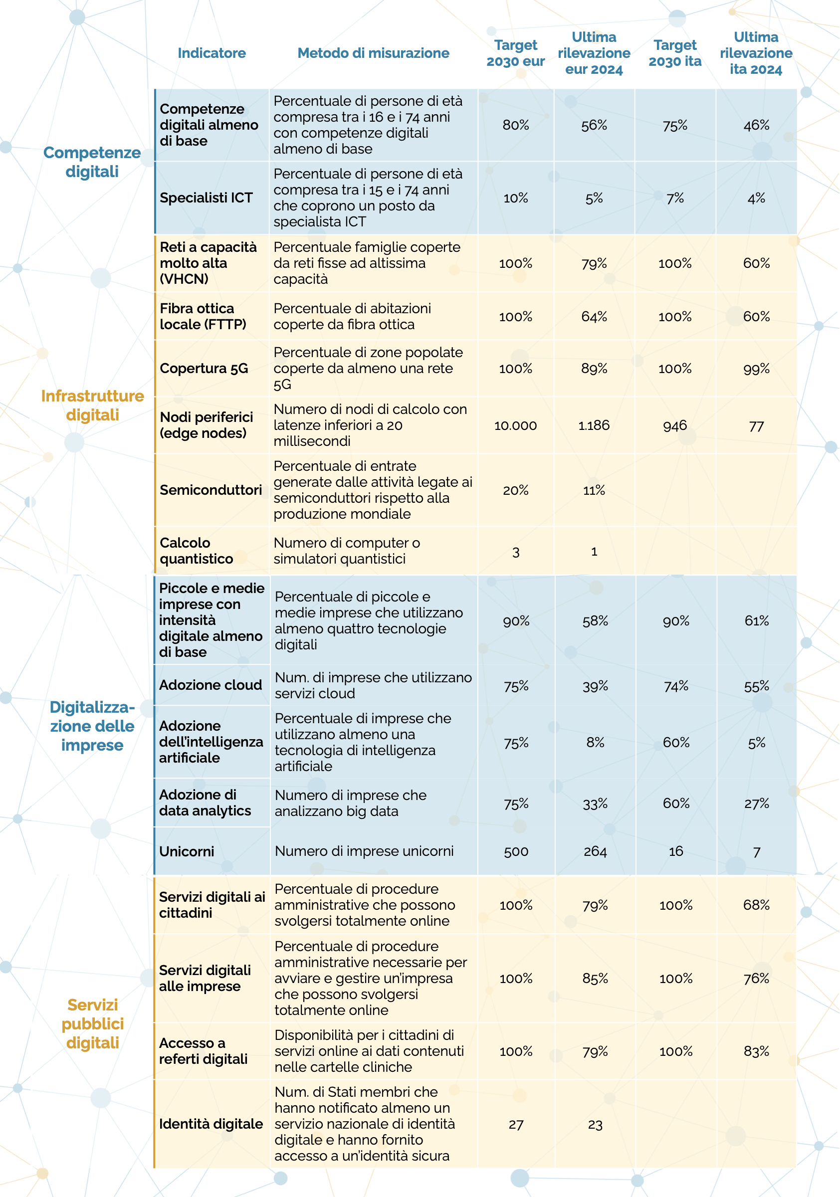 Il rapporto evidenzia come l’Unione europea sia lontana dal raggiungere gli obiettivi che interessano lo sviluppo delle infrastrutture digitali.