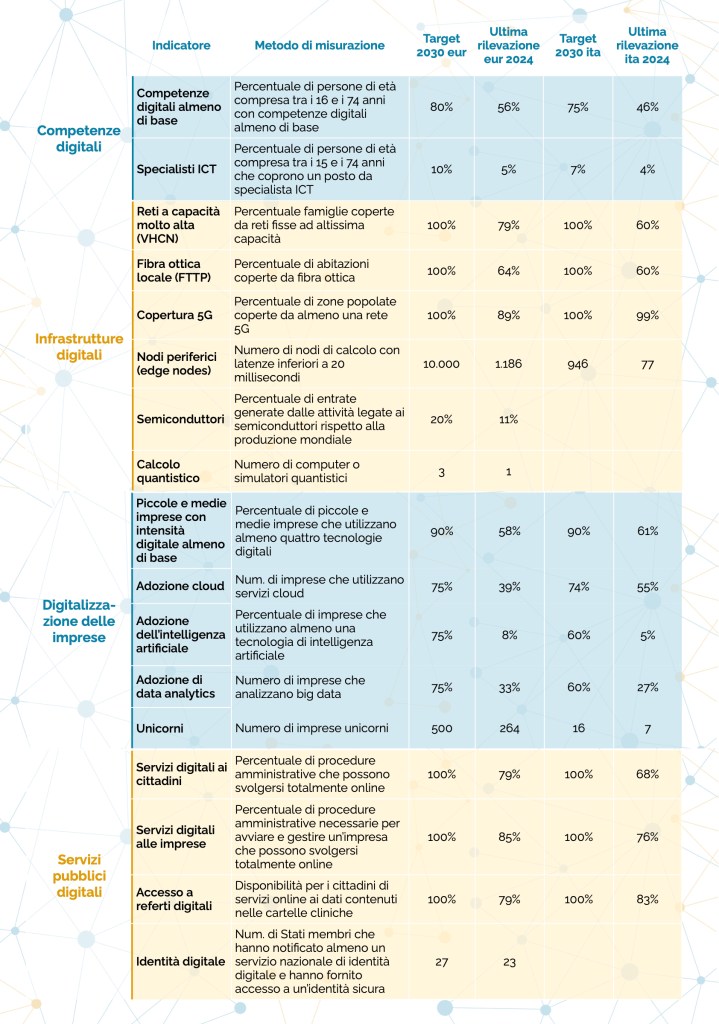 Gli Indicatori chiave di prestazione (Decisione UE 2023/1353 del 30/06/2023) rappresentano la bussola per orientare le politiche digitali europee e per misurare il raggiungimento degli obiettivi fissati per il 2030. Gli indicatori sono 17, raggruppati nei 4 assi di intervento sopra citati (si veda la matrice completa degli indicatori in fondo all’articolo).