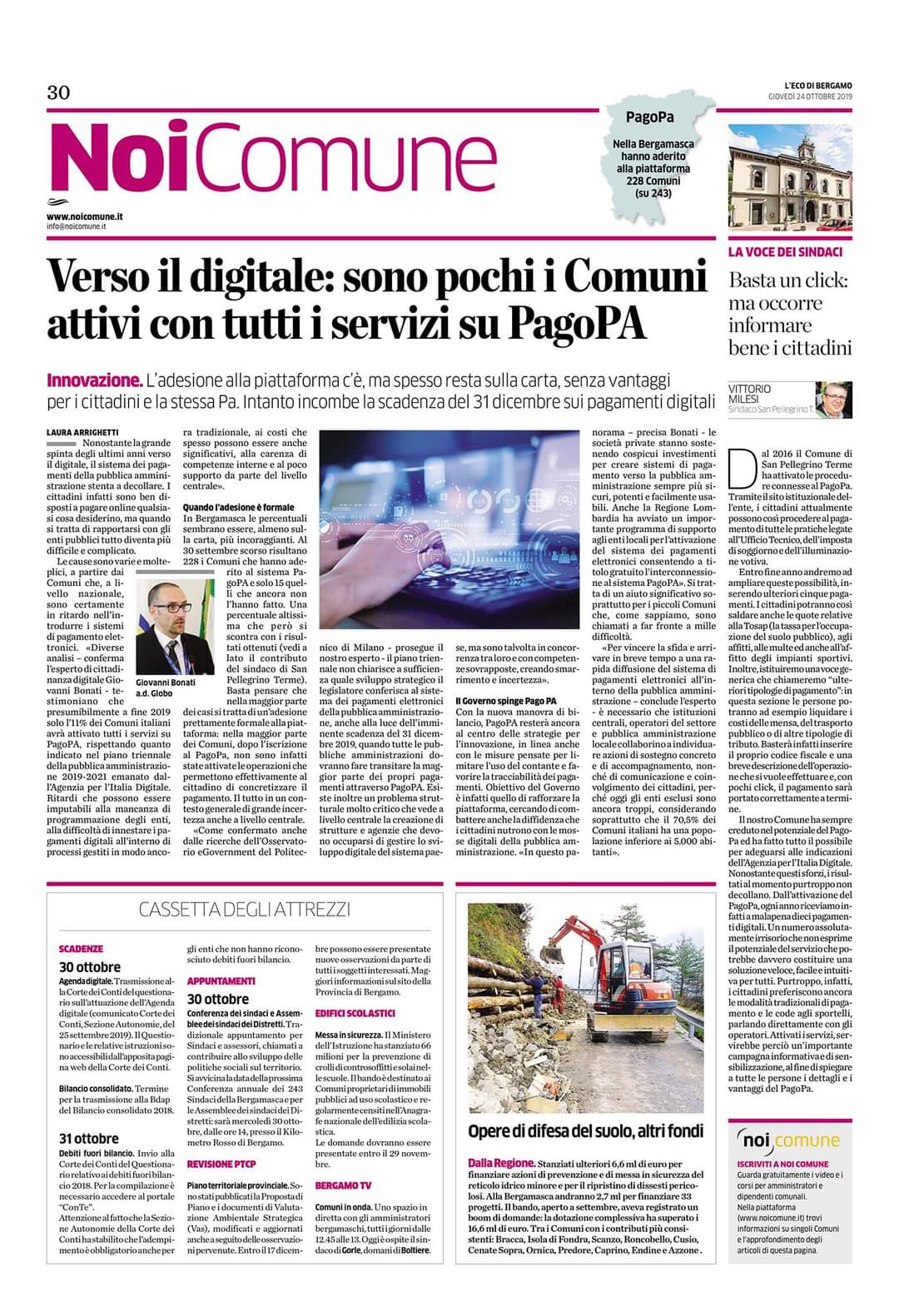 - L’Eco di Bergamo 24/10/2019 Verso il digitale: sono pochi i Comuni attivi con tutti i servizi su PagoPA
