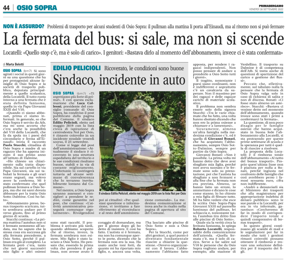 - Bergamo News 23/09/2022 “Studenti lasciati dal bus a 2 km da casa”: proteste a Osio Sopra per la fermata ‘fantasma’