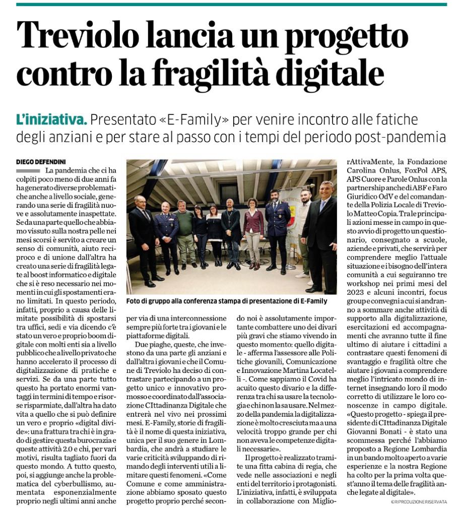 - L’Eco di Bergamo 11/01/2023 «e-Family», a Treviolo il progetto che riconosce e affronta la fragilità digitale