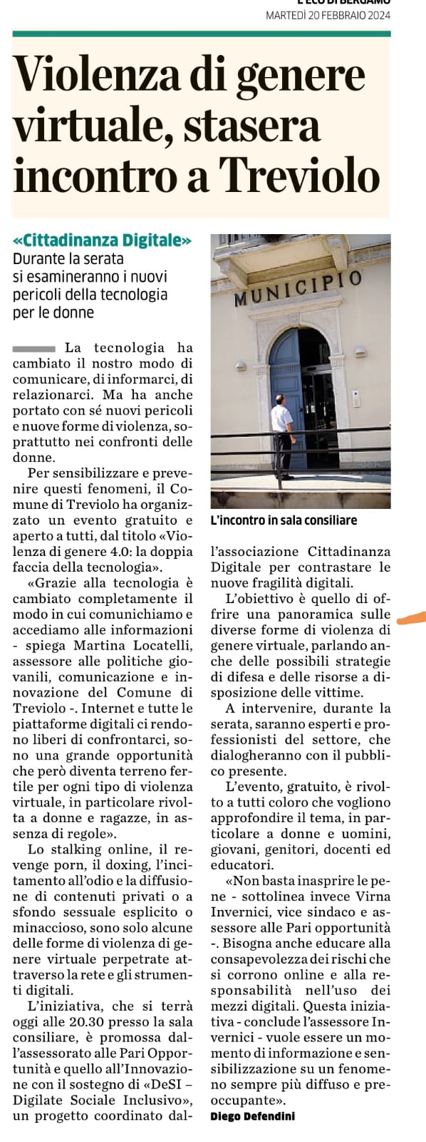 - BERGAMONEWS 16/02/2024 Il Comune di Treviolo lancia “Violenza di genere 4.0”, un evento per riflettere sul ruolo della tecnologia nella questione di genere