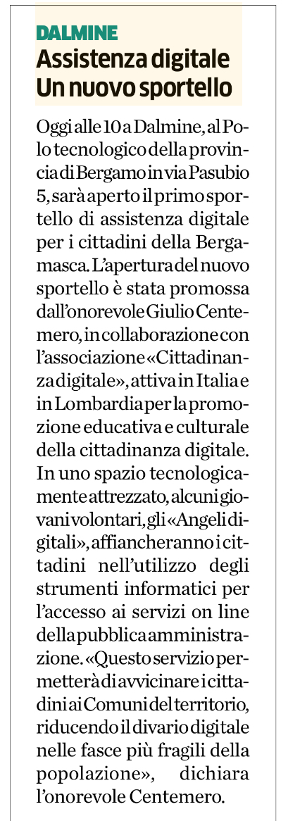 - L’Eco di Bergamo 16/04/2024 Uno sportello aiuterà i cittadini a superare il divario digitale